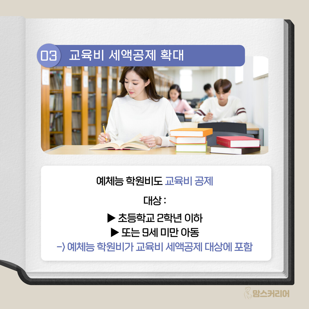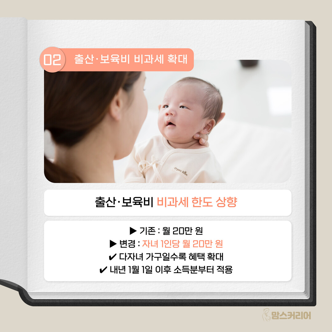 [맘스커리어 = 최영하 기자] 내년부터 출산과 보육비의 비과세 한도를 월 20만 원에서 자녀 1인당 월 20만 원으로 확대하고, 초등학교 2학년 이하 또는 9세 미만 아동의 예체능학원비를 교육비 세액공제 대상에 포함한다.