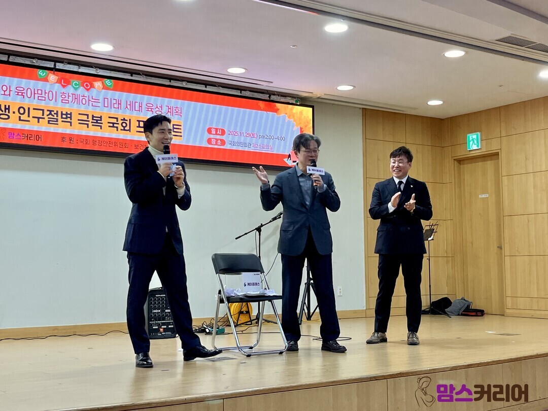 [맘스커리어 = 김보미 엄마기자] 사회적기업 언론사 맘스커리어가 주최·주관하는 '국회에서 함께하는 육아 공감토크'가 29일 오후 2시 국회의원회관 제2소회의실에서 개최됐다. 인구 절벽 시대, 미래세대 양육에 대한 고민을 함께 나누고 저출생 문제의 해법을 모색하기 위해 열린 이날 행사는 국회 행정안전위원회·보건복지위원회와 일동생활건강·아누리·헬로랩·더블하트·바이오모아메디칼·픽셀·라브리에·엘빈즈·럽맘·한국산후조리원연합회·참약사·베이비박스 등 기업 및 단체의 후원으로 마련됐다.