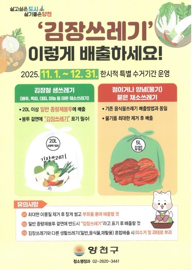 배추·쪽파·대파·마늘 등 양념이 묻지 않은 채소는 20L 이상 일반 종량제봉투를 사용하며, 봉투 겉면에 반드시 ‘김장 쓰레기’라고 표기해야 한다.