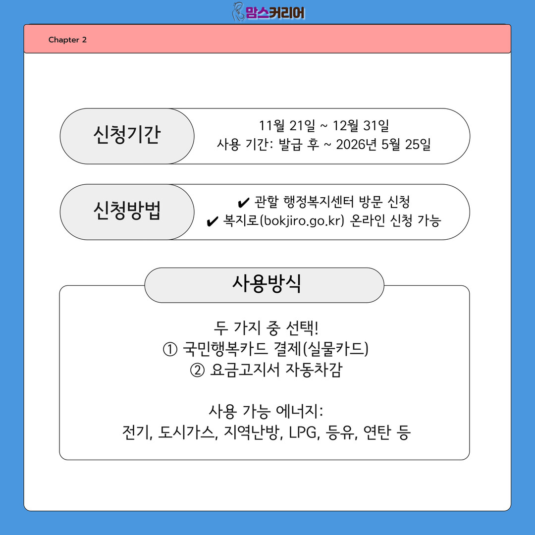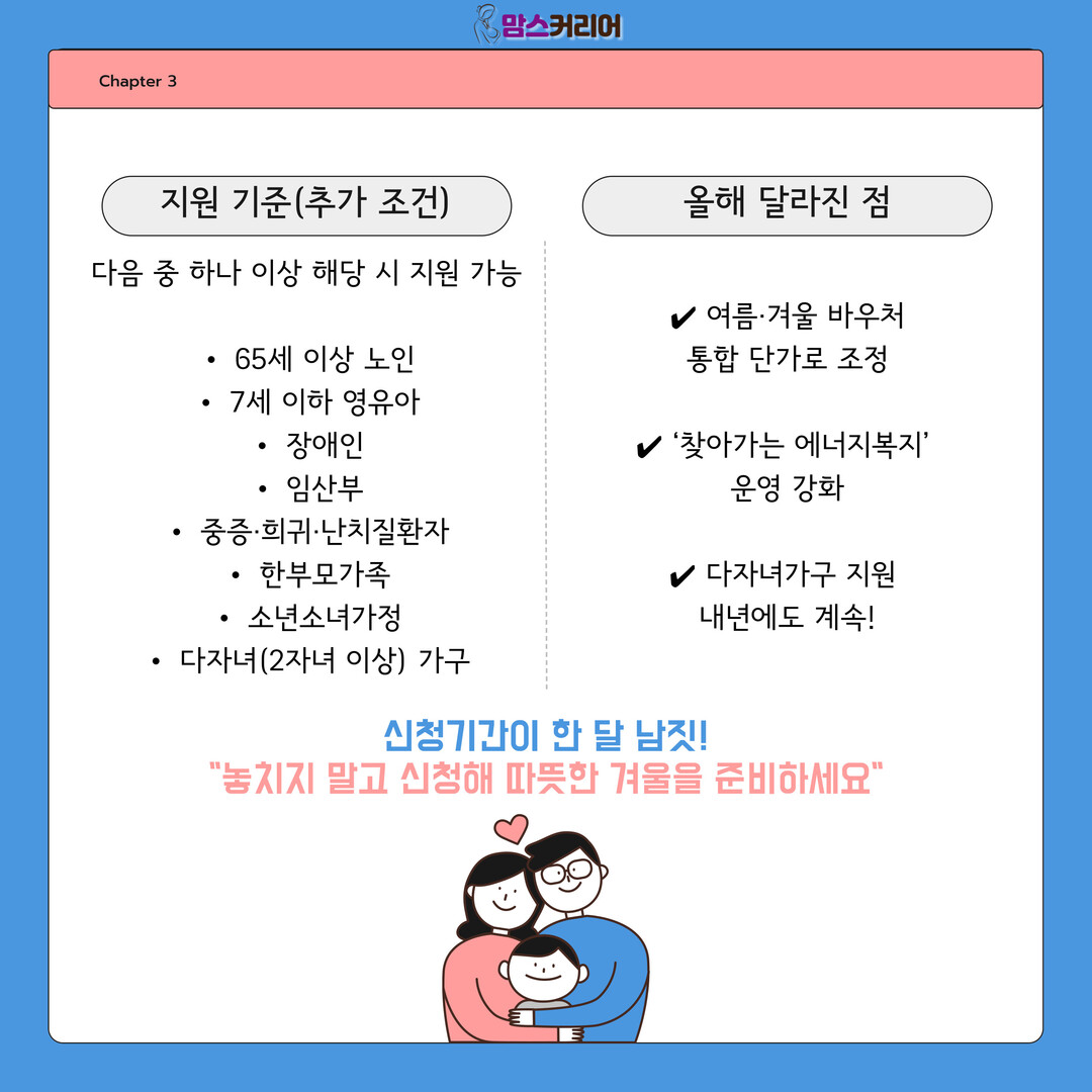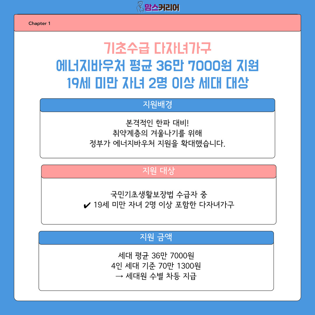 맘스커리어 - [카드뉴스] 기초수급 다자녀가구, 에너지바우처 평균 36만 7000원 지원