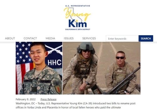영 김(Young Kim) 미 연방 하원의원은 자유 수호를 위해 희생된 한인 전사자를 기리기 위해 현 플라센티아 우체국 이름을 이라크전에서 전사한 김장호일병 이름으로 개명(改名)하는 등의 법안을 최근 발의했다.