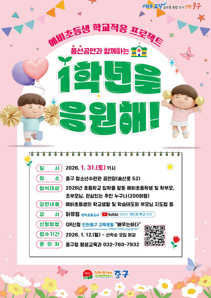 인천 중구는 새 학기를 앞두고 오는 31일 오전 11시 영종국제도시 소재 중구청소년수련관 공연장에서 ‘예비 초등생 학교적응 프로젝트 1학년을 응원해!’를 연다. 현직 초등 교사인 하유정 교사가 강연자로 나선다. 입학 준비 방법, 예비 초등생 학교생활 꿀팁, 학부모 지도법 등에 관한 강의를 제공할 예정이다. 이번 ‘1학년을 응원해’ 프로그램은 첫 학교 입학을 앞둔 학부모들의 걱정과 불안을 덜고, 예비 초등학생들의 안정적이고 빠른 학교생활 적응을 돕기 위해 마련됐다. 질의응답 시간도 마련돼 학부모의 궁금증을 해소할 수 있다. 풍선 공연도 준비돼 아이도 지루해하지 않고 즐길 수 있도록 했다.